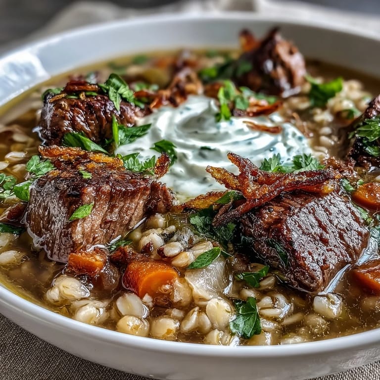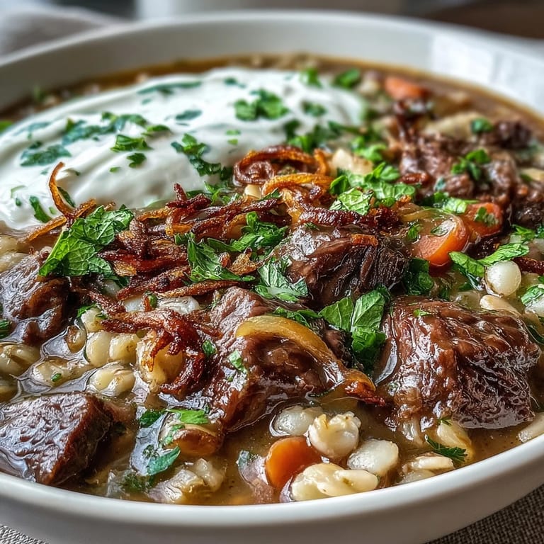 Pin It My neighbor brought over a steaming pot of this soup on a particularly cold afternoon, and I watched her ladle it into bowls with the kind of casual confidence that comes from making something dozens of times. The aroma—earthy barley, warm turmeric, fresh herbs—filled my kitchen before she'd even finished the first serving. She swirled in sour cream and topped it with these crispy mint-fried onions that had me mesmerized, and after one spoonful, I knew I had to learn her secrets. That was three winters ago, and now this Persian-inspired beef and barley soup has become my own version of comfort in a bowl.